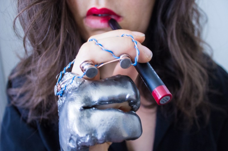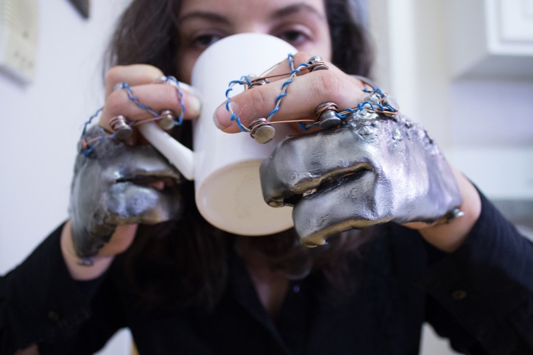 A wearable kinetic forged steel sculpture for the hands. Solimanto has experienced intermittent bouts of hand palsy from muscle spasticity caused by multiple sclerosis which causes her to feel shame from the stigmas surrounding this condition. For example, during one of Trump’s speeches he mocked the reporter Serge Kovaleski with a health condition surrounding his hand and arm implying his condition with his arm impacted his intelligence. This political piece explores an empowering approach on the stigmatization associated with health conditions.