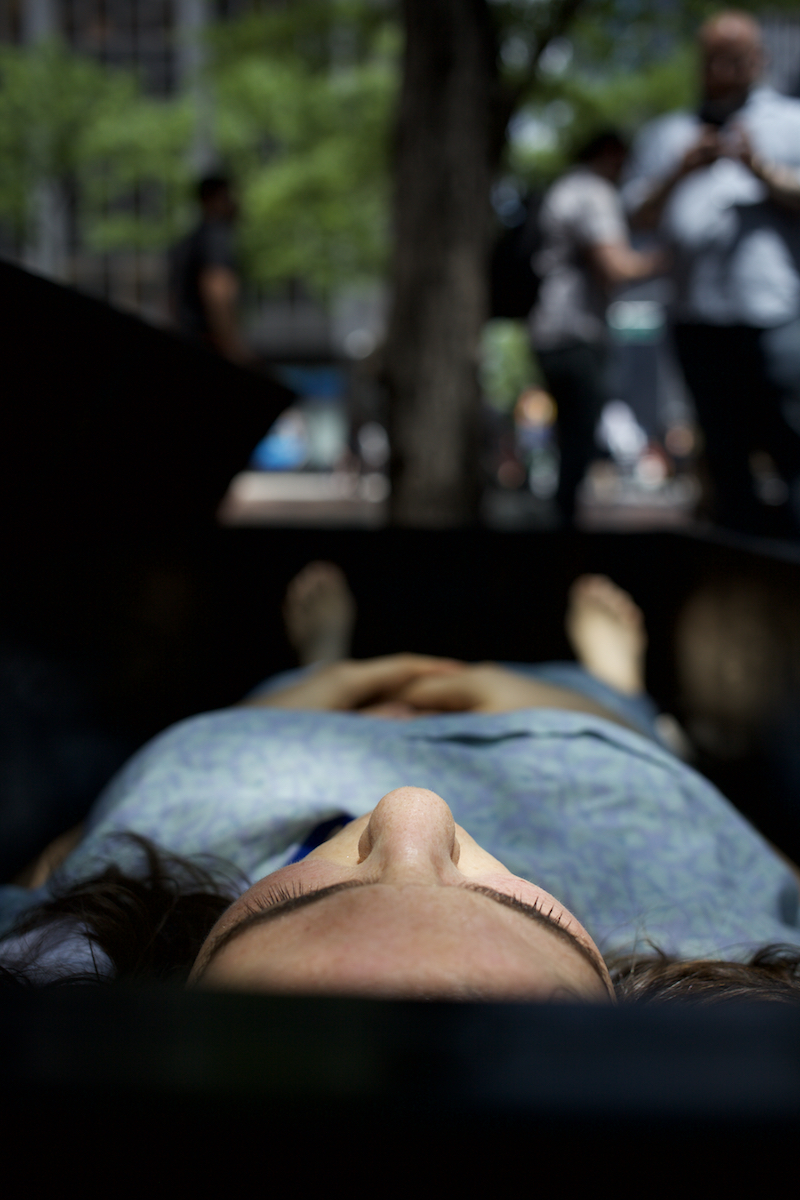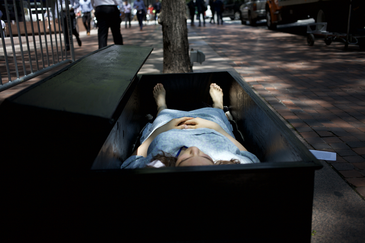 On Tuesday, June 13, at 1pm, on the street at 780 3rd Ave, New York, NY, I entered into a coffin, and performed “dead” in a patient gown for 24 hours outside Senators Schumer and Gillibrand’s Office protesting the fast tracking of TrumpCare.