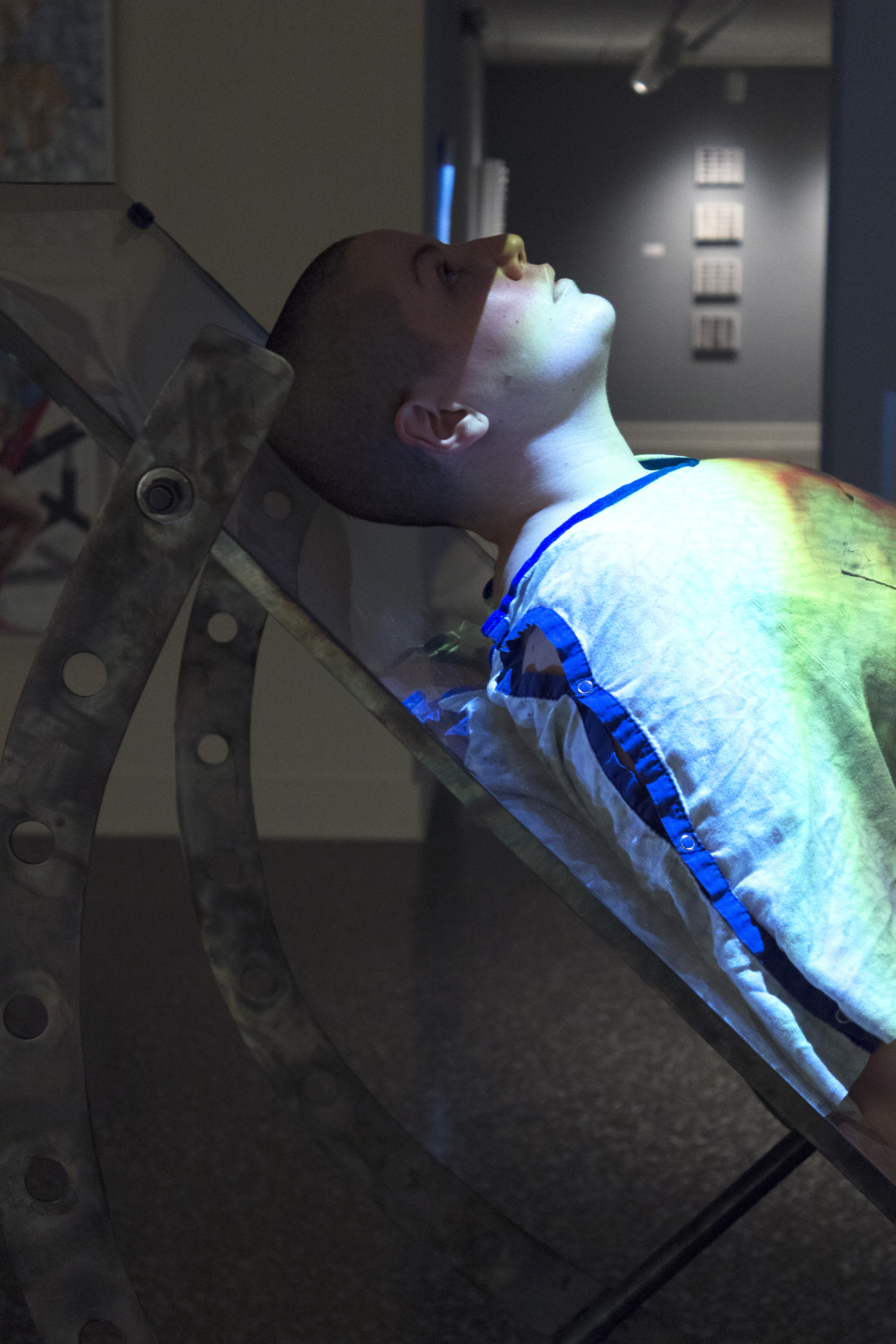 The performer stood on the small steel platform for two hours to withstand and depict the physical and mental pain involved in hospitalization, the spectacle of monstrosity and analyzation of abnormalcy. A transformation of space occurs, as the performance venue becomes the hospital, and the audience the guests entering my patient room.